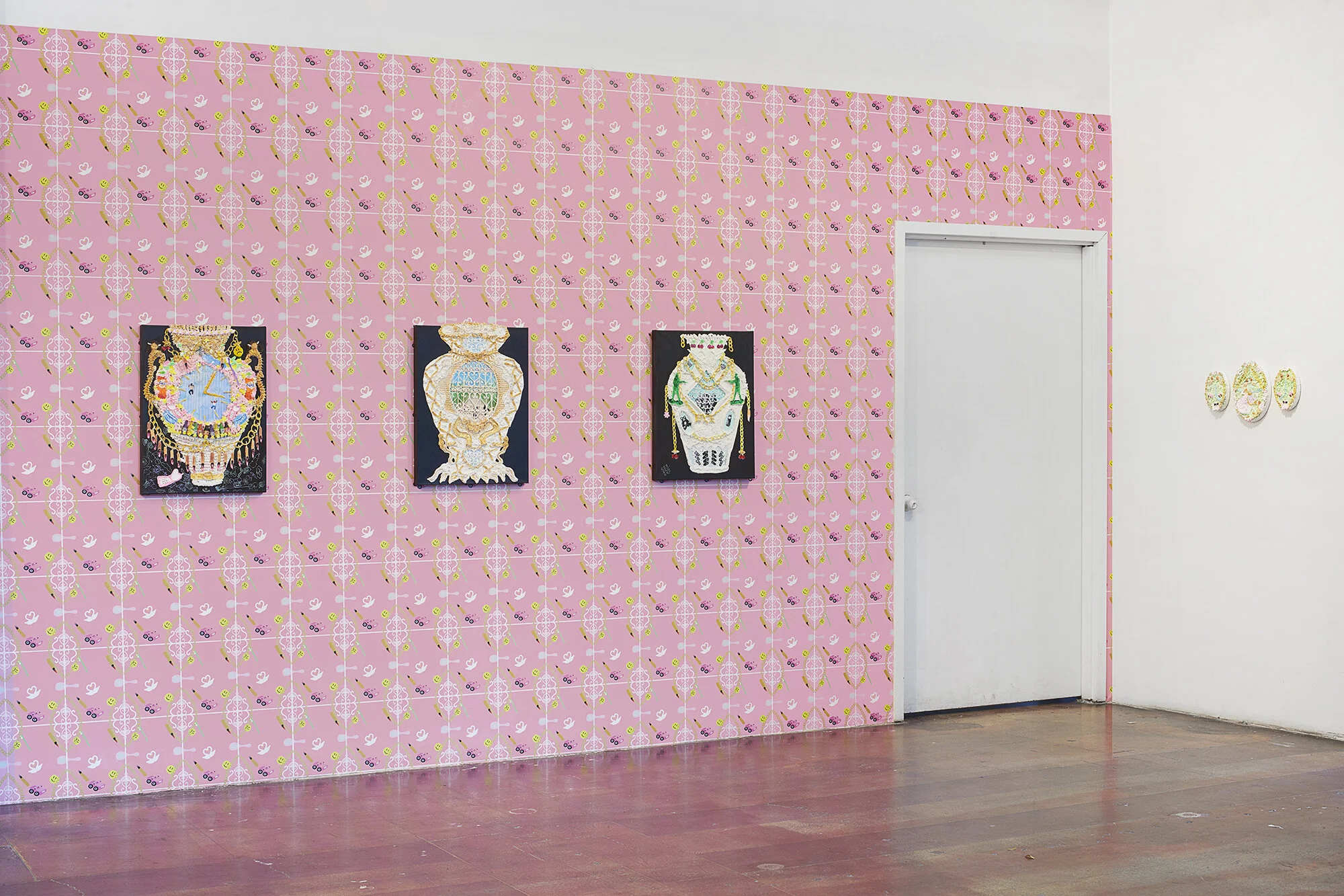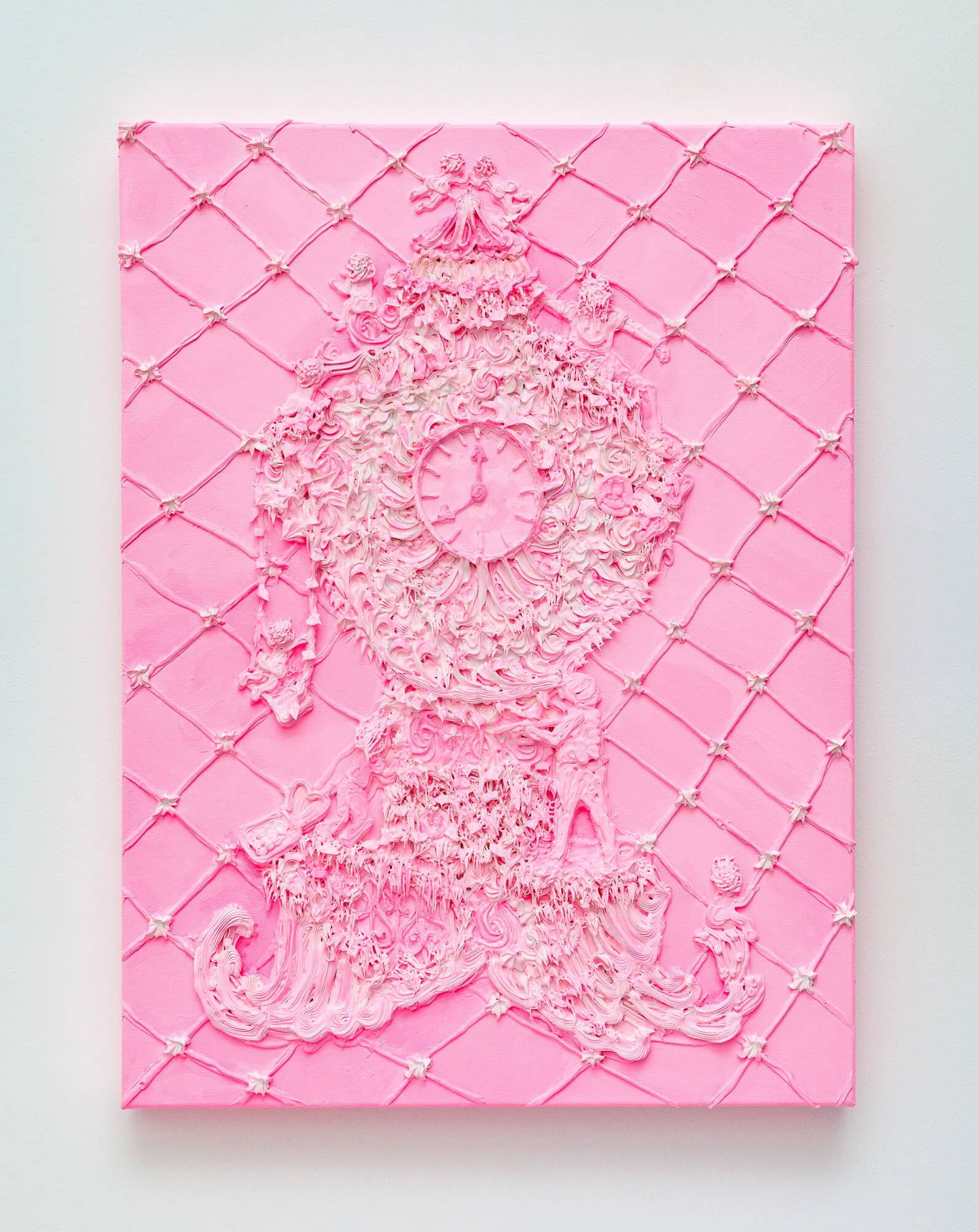 At first impression, the canvases of Yvette Mayorga radiate an innocence that allows for further unwary examination. The piped brushstrokes with pastel(1) colors and rich surfaces recall the vacuous formalism that reigned supreme in Marie Antoinette’s Versailles court. However, her overwhelmingly sweet surfaces erase the imperial cogitative “let them eat cake,” and instead, challenge this rhetoric through a different narrative. Upon closer inspections her images appear to melt into unpolished sugary scenes that problematize a superficial encounter with her art as solely an extension to her Latinx heritage, femininity, legal status, and expectations of childhood amidst all these markers of identity. It is at the intersection of these expectations where these images come to life, not as 18th century French fantasies, but as windows into contemporary reality.
