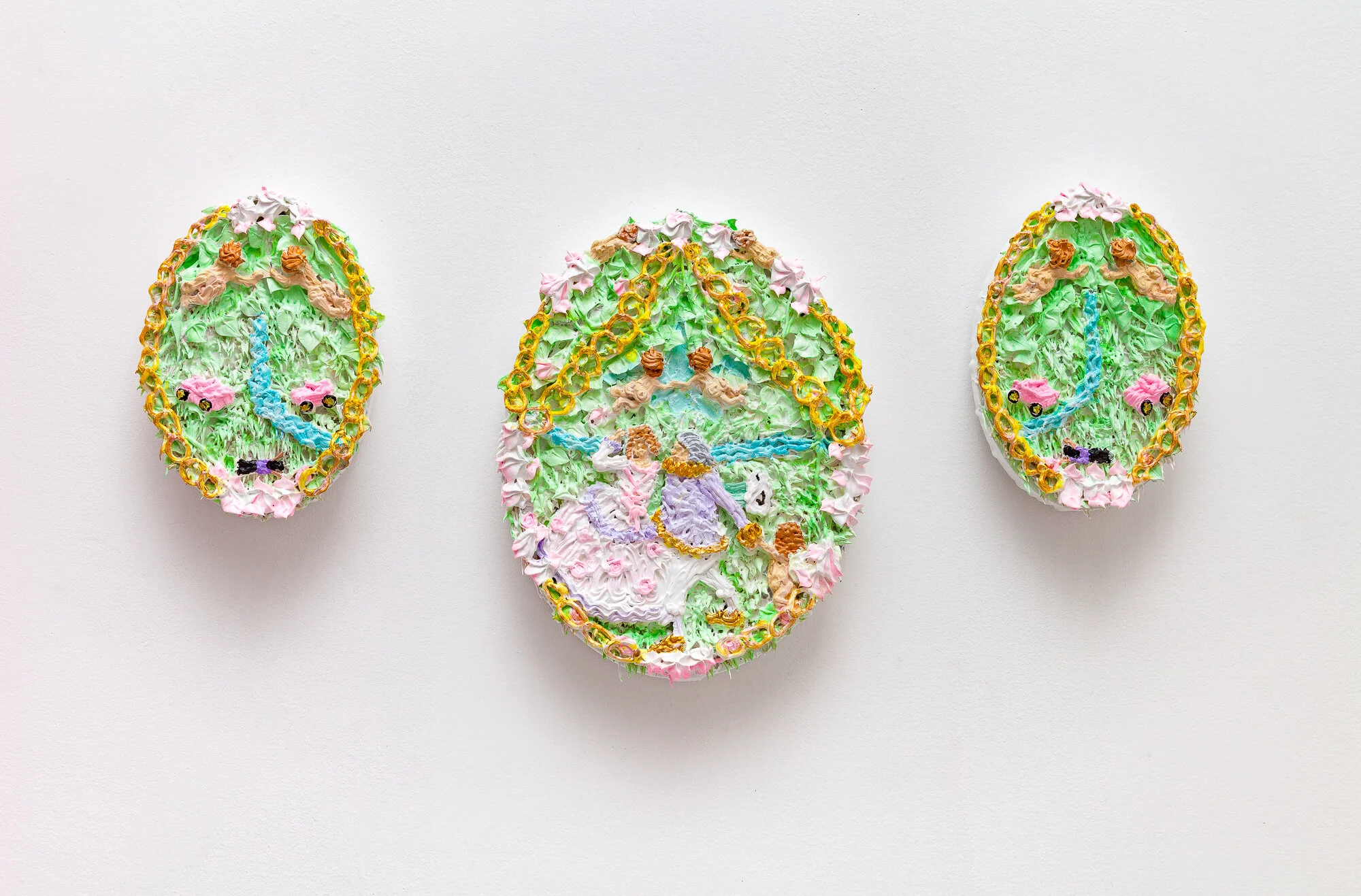 Two Lovers (After Rocco Porcelain Urn 19th c.), 2019, acrylic piping on canvas, 5” x 7”, 8” x 10,” 5” x 7”