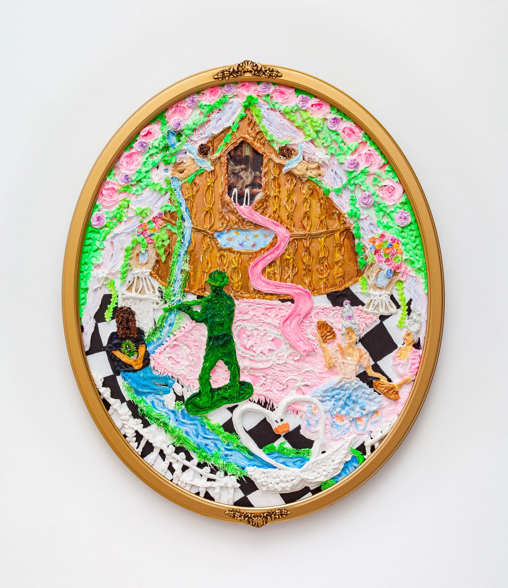 I Remember Eating Hot Chips when my Dad got Deported, After J.H. Fragonard, “The Swing,” 2017, acrylic piping on canvas, 20” x 24”