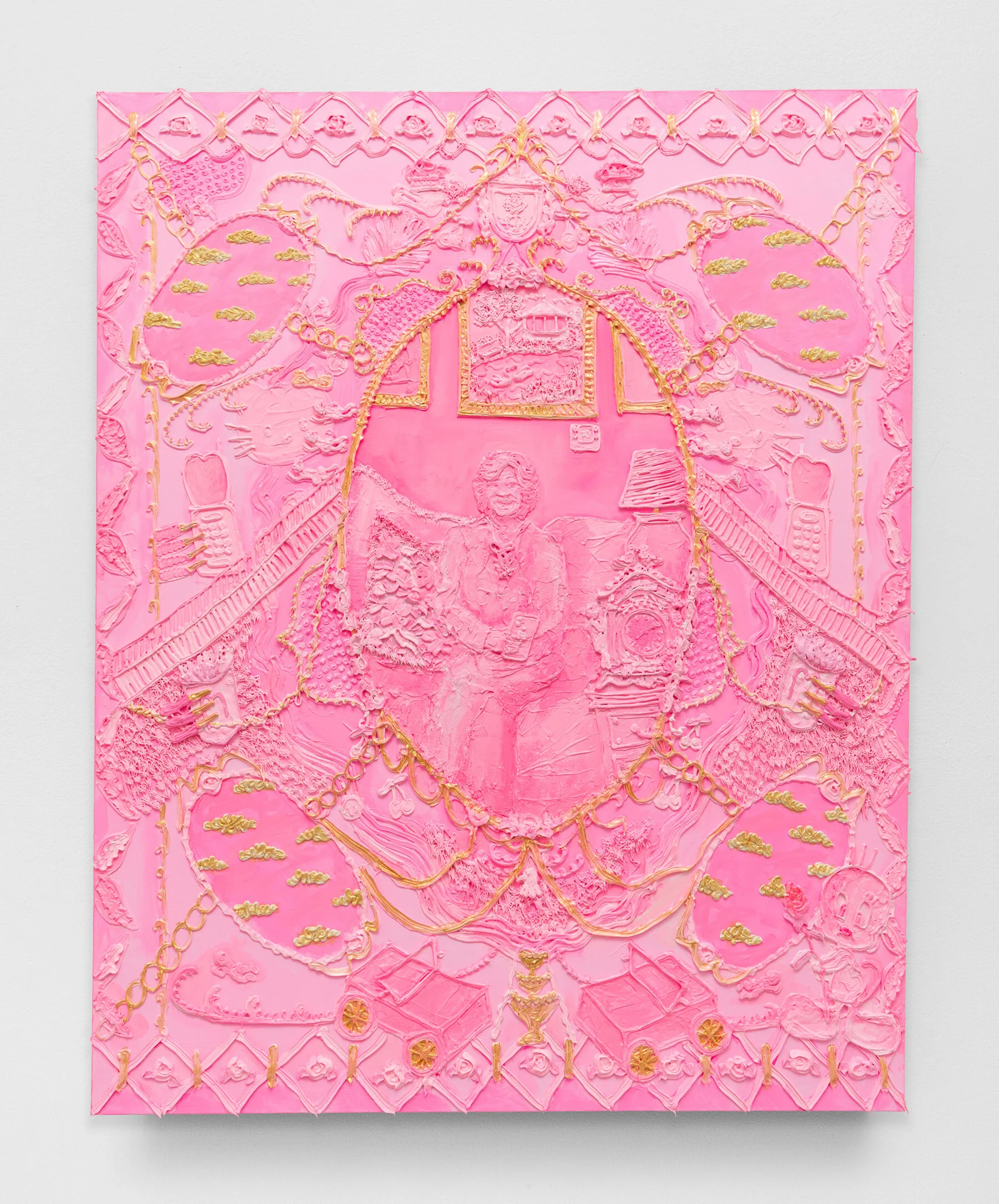 Pinknologic Anxiety (After Francois Boucher, Madame de Pompadour, c. 1755), 2020, acrylic piping and collage on canvas, 30” x 40” triptych