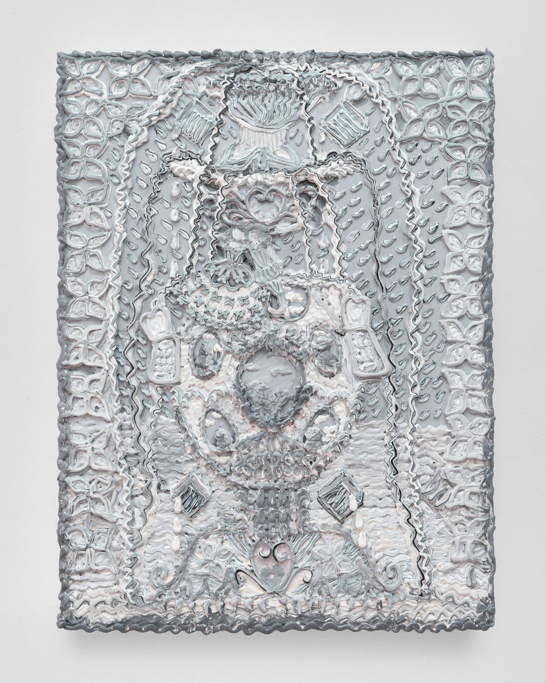 Portraits of the Forgotten, 2020, acrylic piping, collage, glitter, rhinestones, porcelain, and textile on canvas, 48" x 60"