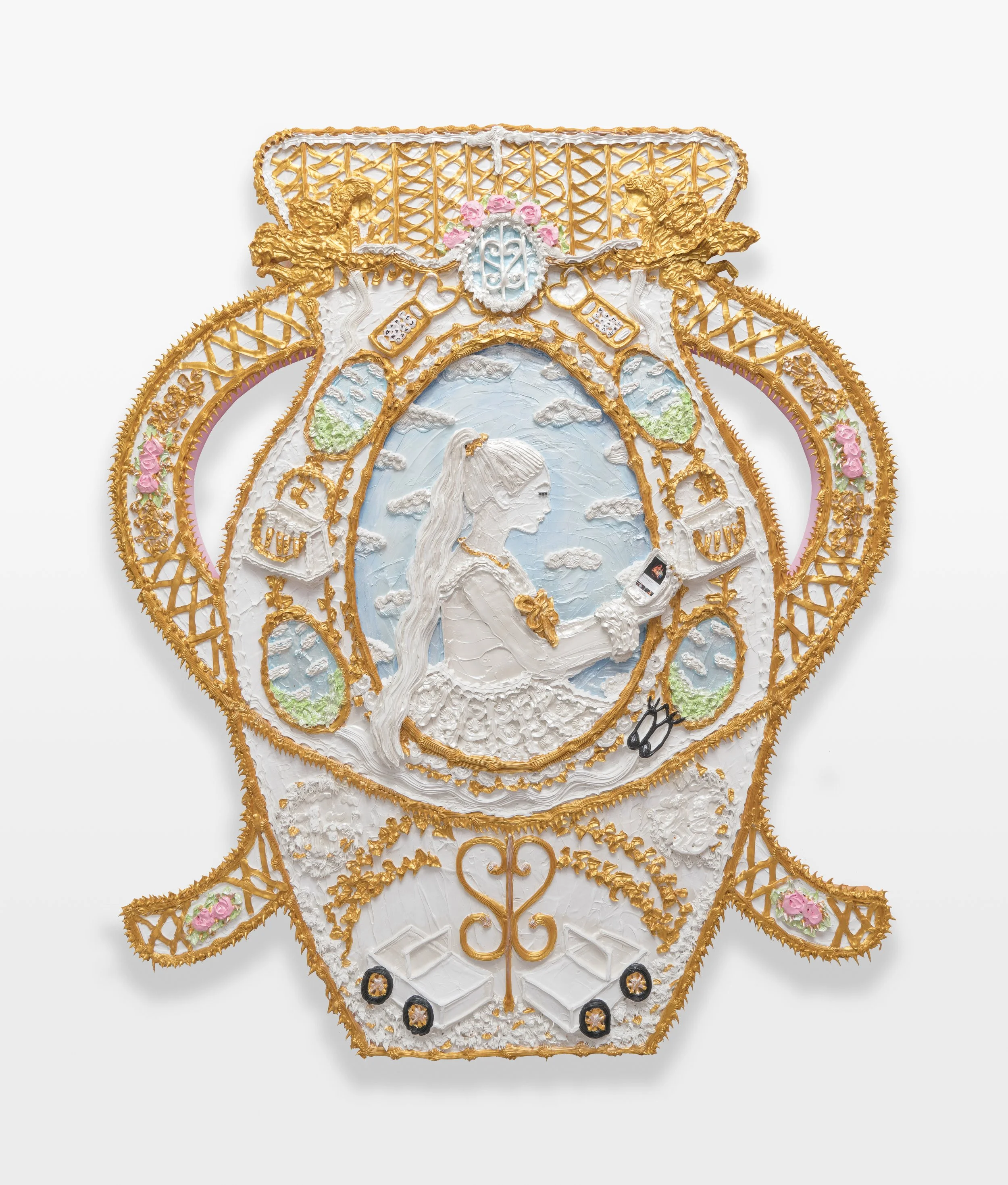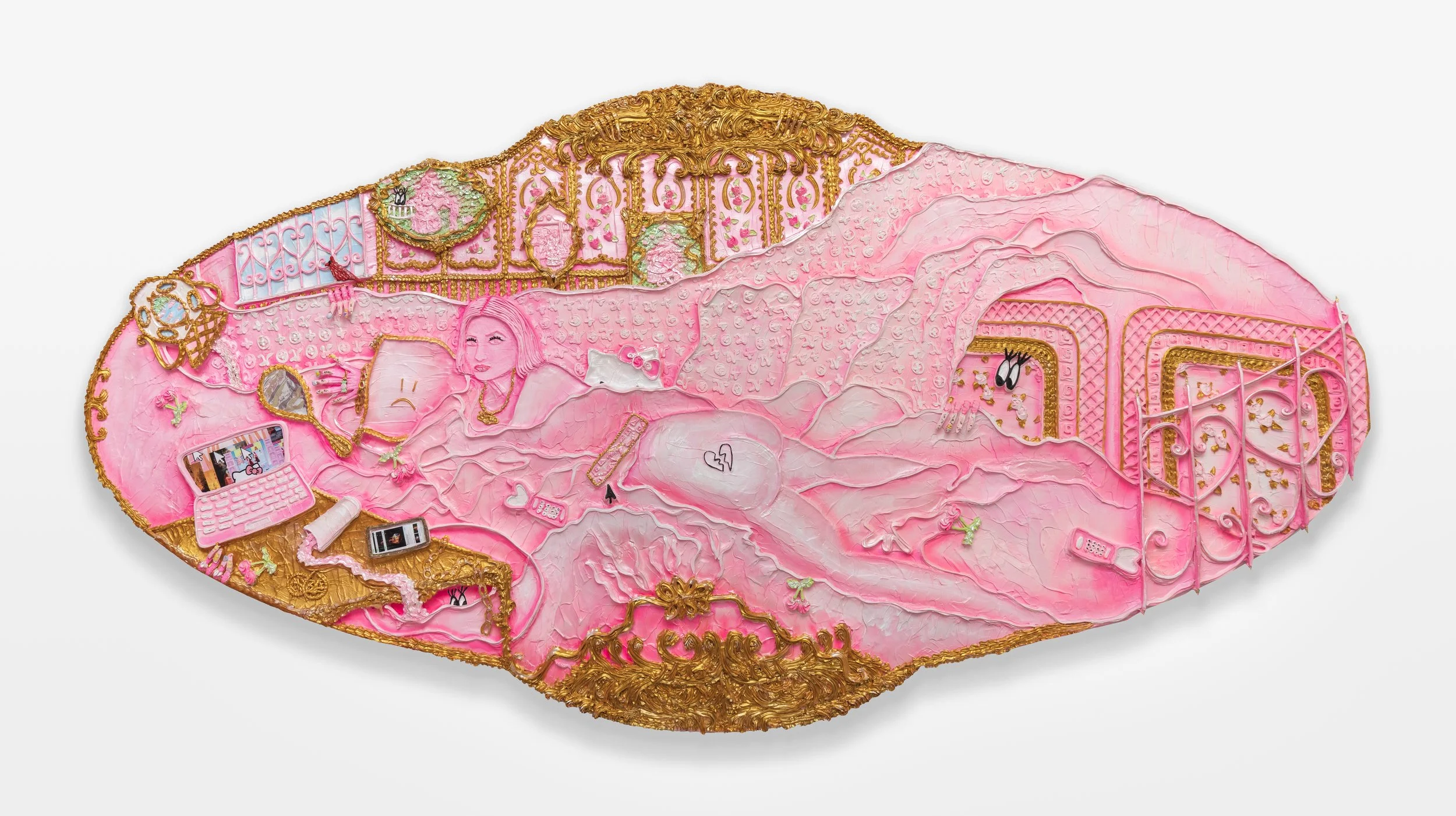 Resting Gurl 2 A Vase of the Century Series Century Vase c 1876, 2022, acrylic nails, false eyelashes, plastic nail charms, rhinestones, collage, and acrylic piping on wood panel, 60” x 50”
